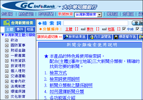 針對中時報系龐大的新聞資料庫,竭盡自動分類暨人工智慧的極限,依主體、事件、地區29大類、124中類、及748小類的專屬分類及三座標檢索設計,充份達到資訊快速查詢的功能。